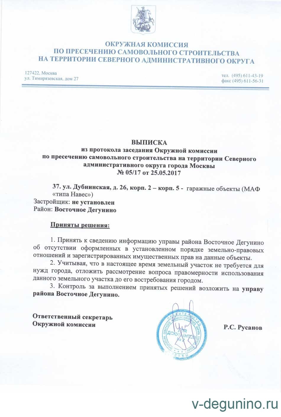 Согласно выписке из протокола заседания Окружной комиссии по пресечению самовольного строительства на территории Северного административного округа города Москвы от 25.05.2017 № 05/17 в случае принятия решений органов исполнительной власти города Москвы о развитии (благоустройстве) данной территории, будут проведены мероприятия по ее освобождению от данных объектов.