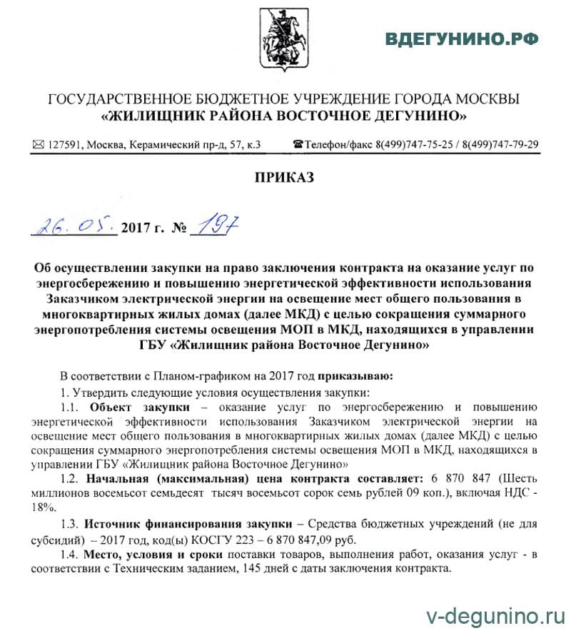 Оказание услуг по энергосбережению и повышению энергетической эффективности использования Заказчиком электрической энергии на освещение мест общего пользования в многоквартирных жилых домах (далее МКД) с целью сокращения суммарного энергопотребления системы освещения МОП в МКД, находящихся в управлении ГБУ «Жилищник района Восточное Дегунино».