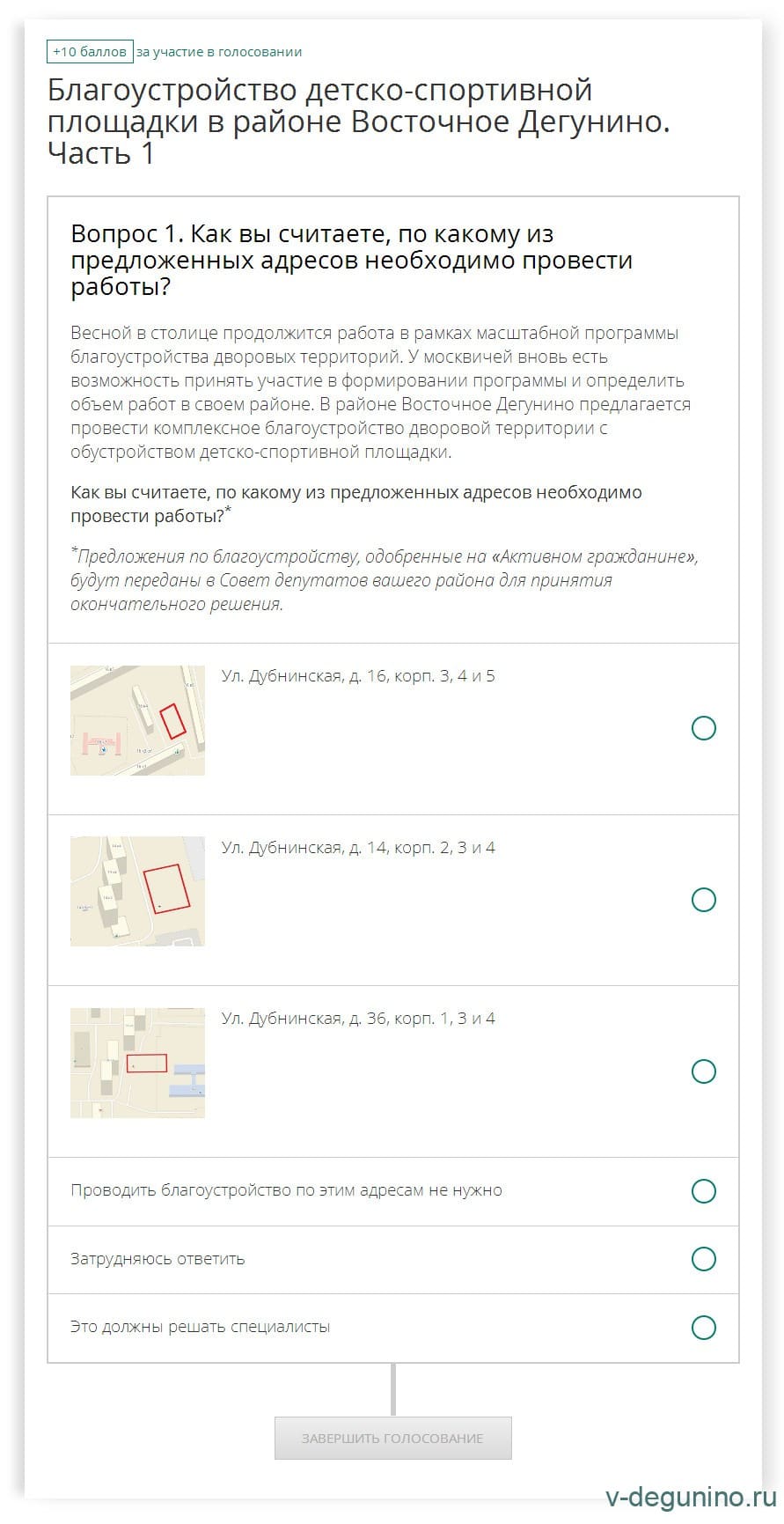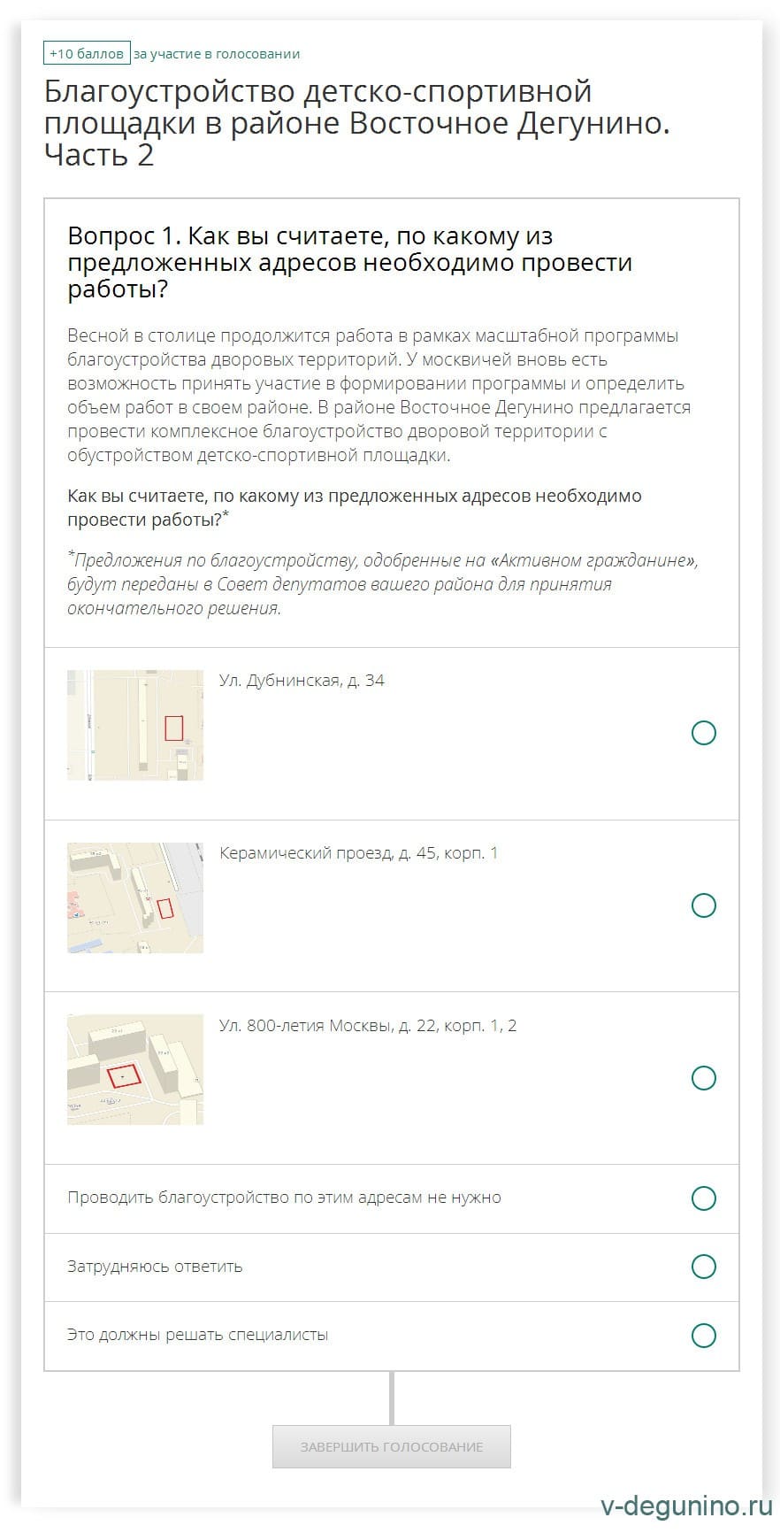 На Фиктивном гражданине идёт два опроса о благоустройстве 6 детских площадок в районе Восточное Дегунино в 2019 году.