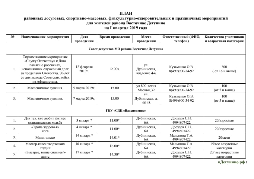 февраль Дубнинская, 8А* Дроздов С.Н. 4994807422 100/все возрастные категории