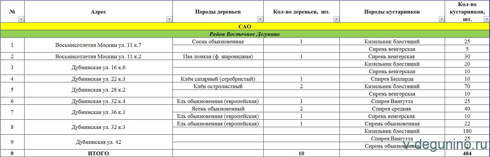 Миллион деревьев. Восточное Дегунино. Адреса посадок весна 2019 г.