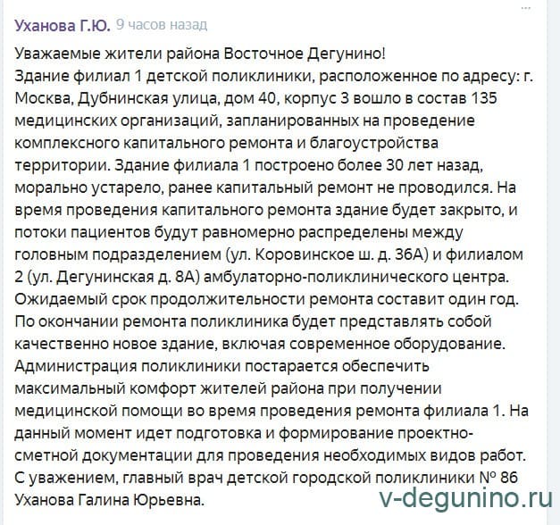 О закрытии на капитальный ремонт поликлиник № 188 и № 86 р-н Восточное Дегунино