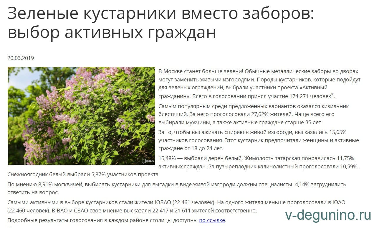 А помните программу Миллион деревьев? Их тогда в Восточном Дегунино много посадили. Недавно обратил внимание, что этих кустов нет, вообще, может %10 осталось. И уничтожили их судя по всему дворники Жилищника, сначала закидывали их снегом, а потом весной ворошат снег лопатами, перерубая ветки, стоя прямо на этих кустах. Видимо таже участь ждёт кустарники, что посадили на псевдосубботниках. Это конечно был цирк :-) Вы это видели? Люди с граблями скребли чистые газоны, которые накануне вычистили дворники :-)