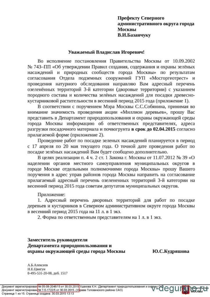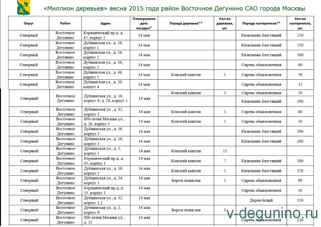 Определены адреса и наименования деревьев и кустарников для посадки весной 2015 года в рамках программы "Миллион деревьев" в районе Восточное Дегунино САО города Москвы