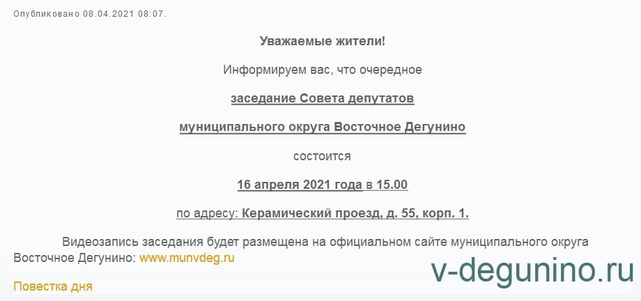 16.04.2021 г. Заседание Совета депутатов муниципального округа Восточное Дегунино