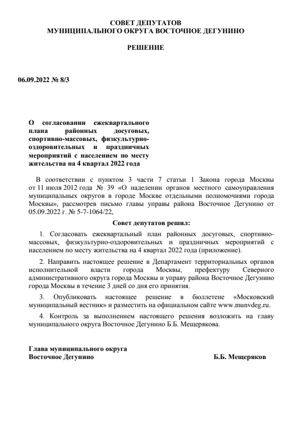 к решению Совета депутатов муниципального округа Восточное Дегунино от 06 сентября 2022 года № 8/3