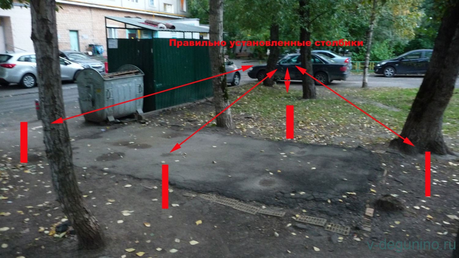 1. Ограничиваем парковочное место столбиками, в перспективе в 2016-м с формированием полноценного стояночного места с бордюрами. Для справки: там раньше ракушка стояла.