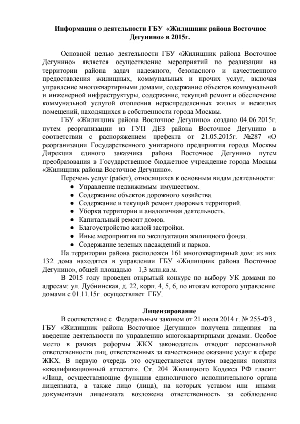 Годовой отчёт "О работе ГБУ "Жилищник района Восточное Дегунино" в 2015 году"