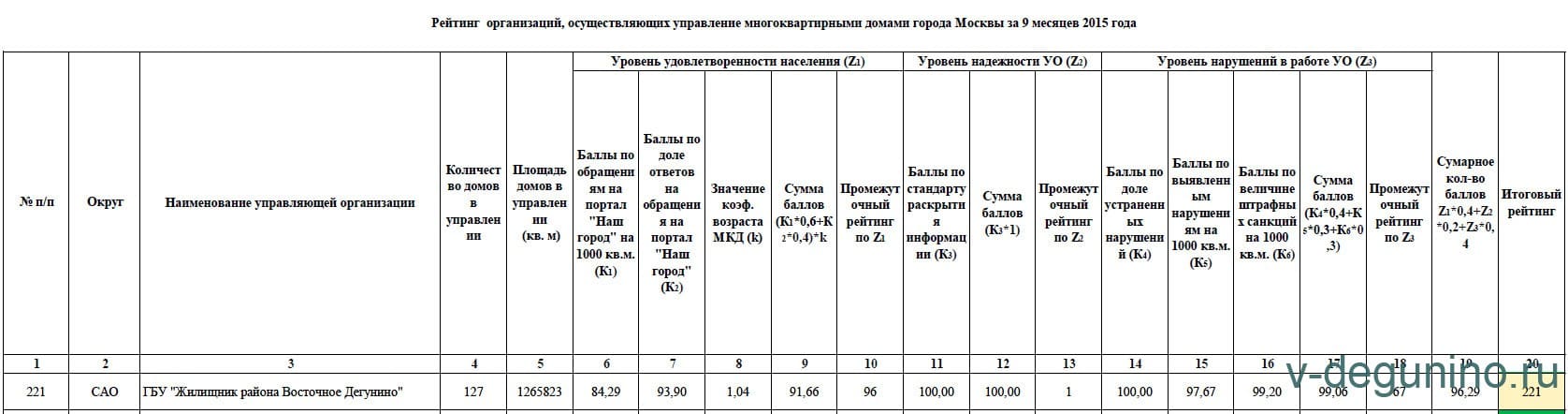 По итогам 9 кварталов 2015 года ГБУ Жилищник района Восточное Дегунино занял 221 место среди 486 управляющих организаций Москвы.