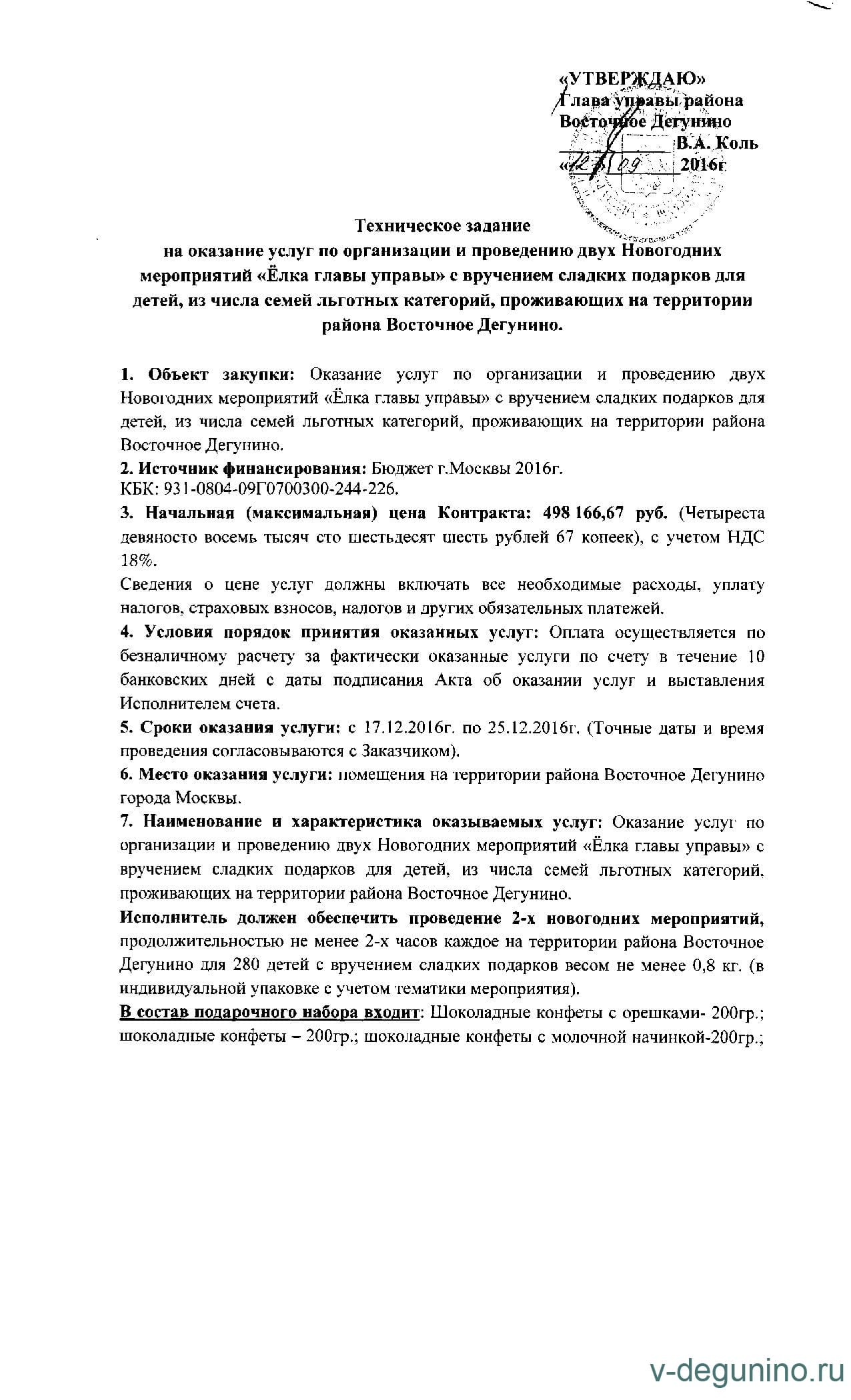 Оказание услуг по организации и проведению двух Новогодних мероприятий «Ёлка главы управы» с вручением сладких подарков для детей, из числа семей льготных категорий, проживающих на территории района Восточное Дегунино.