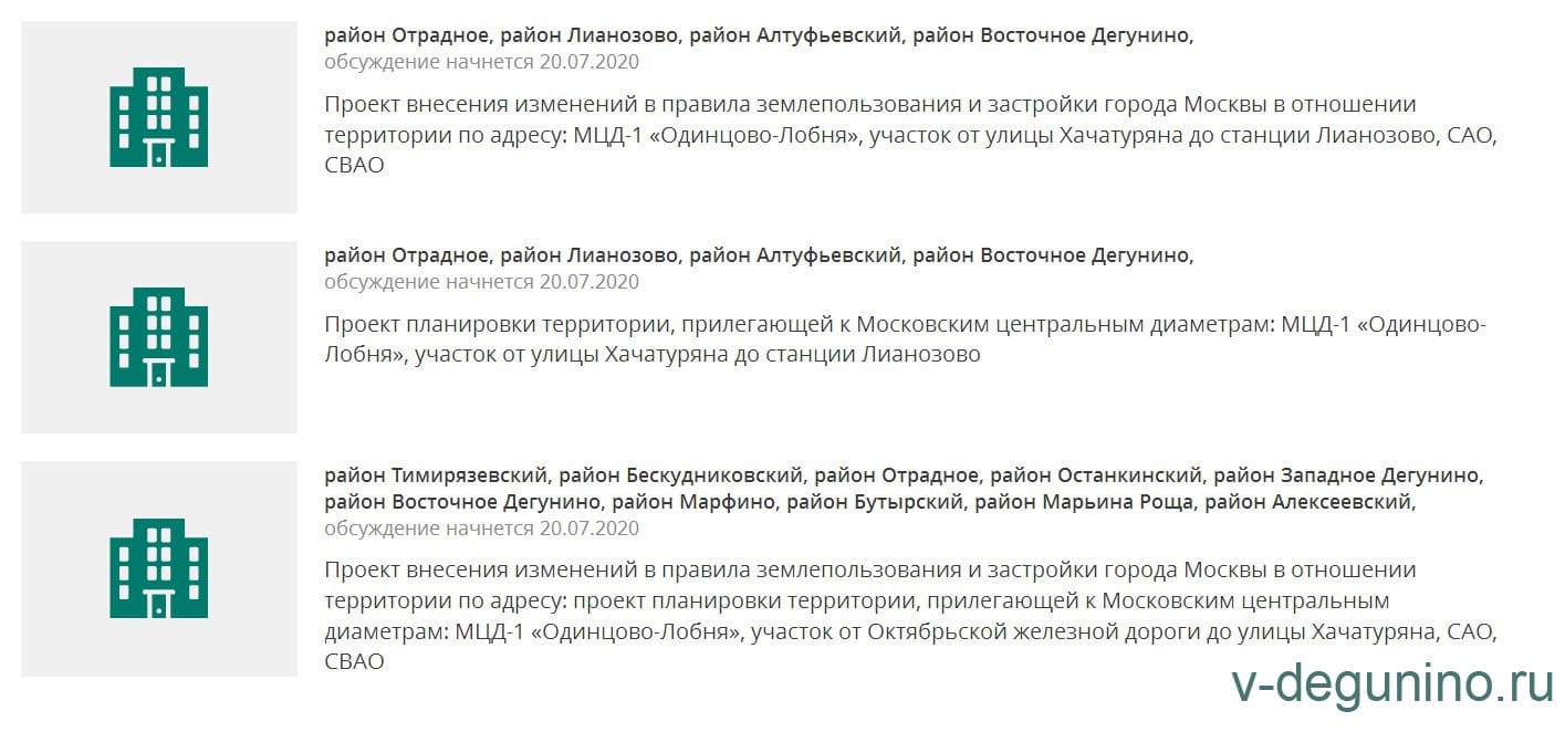 · планировки территории, прилегающей к Московским центральным диаметрам: МЦД-1 «Одинцово-Лобня», участок от улицы Хачатуряна до станции Лианозово;
