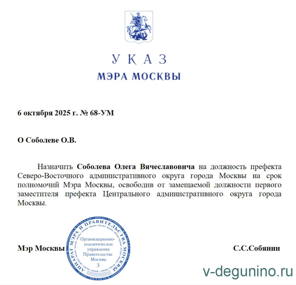 Префектом Северо-Восточного административного округа Москвы назначен Соболев Олег Вячеславович.