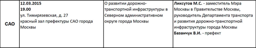 12 марта 2015 года в Красном зале префектуры состоится встреча префекта Северного административного округа города Москвы В. И. Базанчука и руководителя Департамента транспорта М. С. Ликсутова с жителями округа.