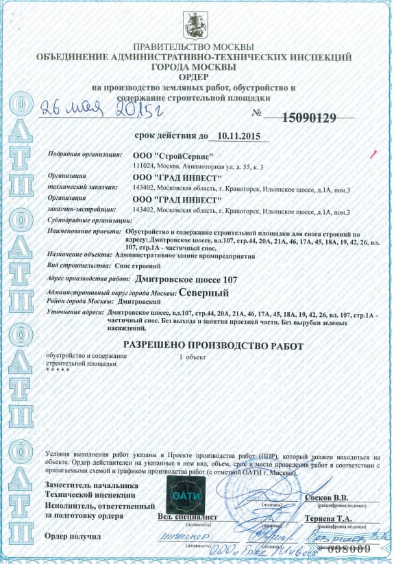 Ордер на производство работ ЖК «Город»