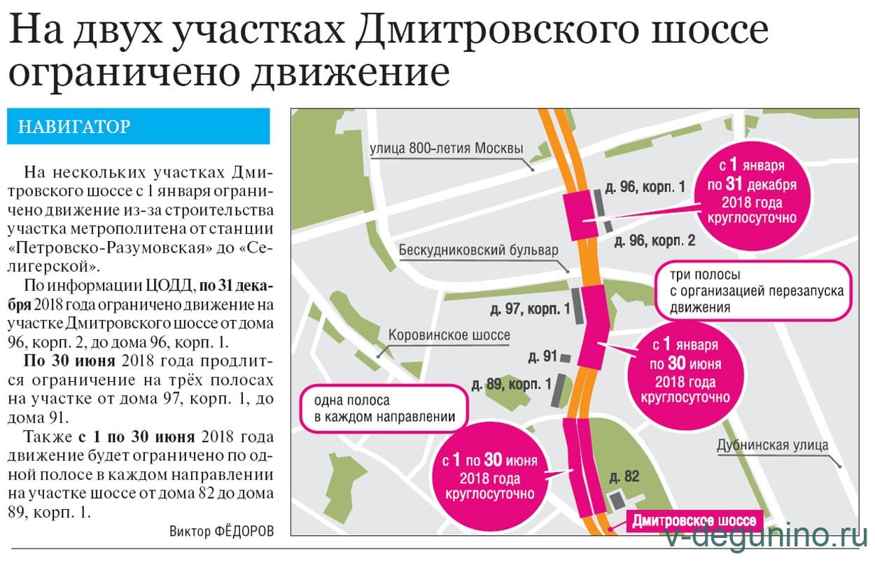С 1 января 2018 г. ограничено движение по Дмитровскому шоссе от Коровинского шоссе до улицы 800-летия Москвы.