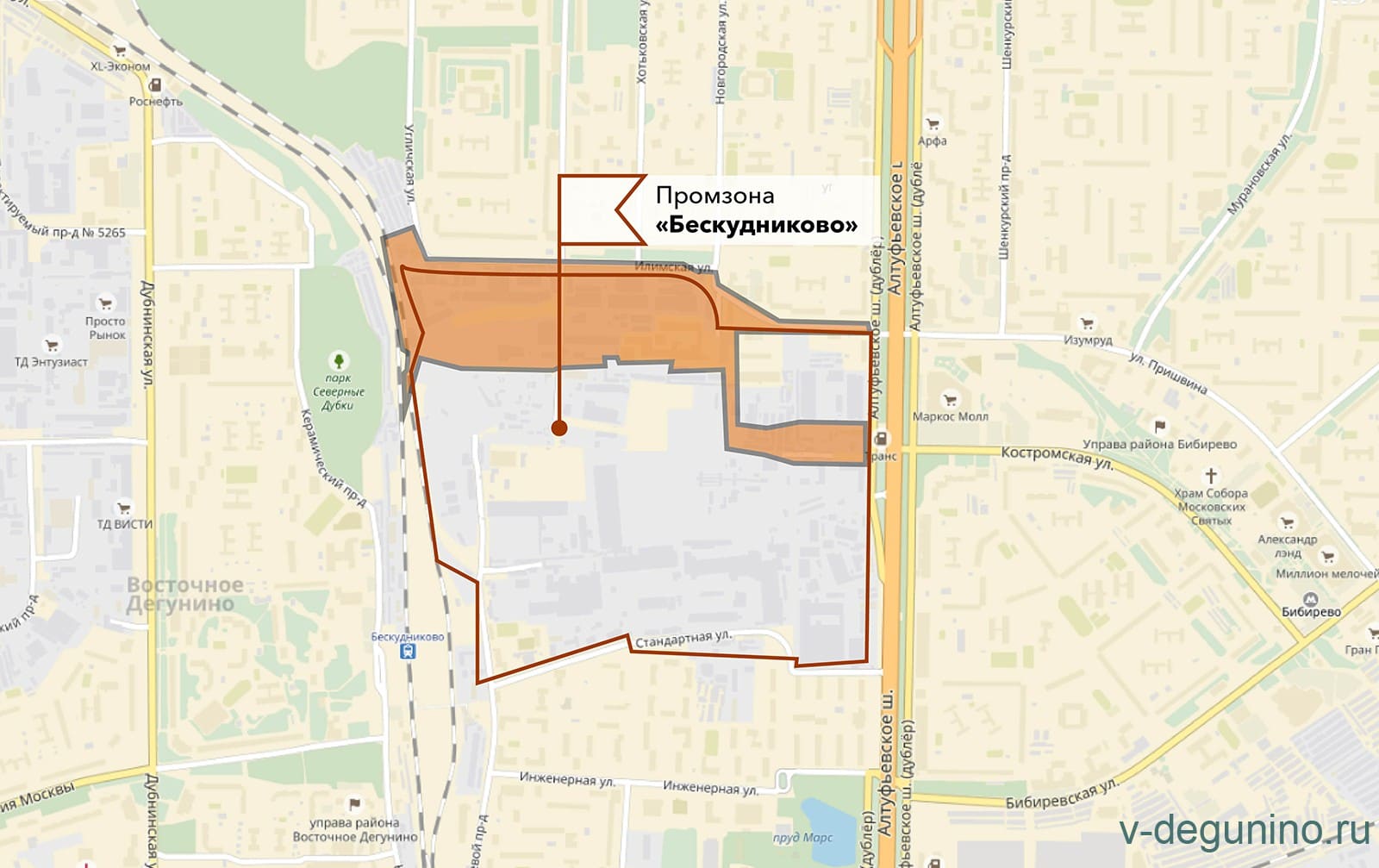 Напомним, промзона «Бескудниково» ограничена улицей Илимская, Алтуфьевским шоссе, функциональными зонами № 10 и №11 района Алтуфьевский и № 1 района Лианозово, а также полосой отвода путей Савеловского направления Московской железной дороги.