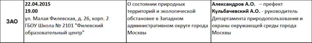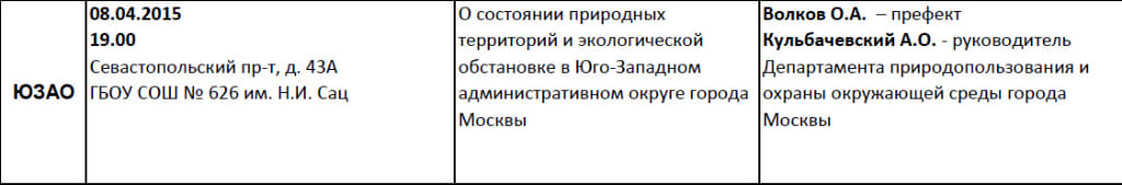 Встреча жителей с руководителем Департамента природопользования и охраны окружающей среды города Москвы Кульбачевским А.О. 08.04.2015 г. и 22.04.2015 г.