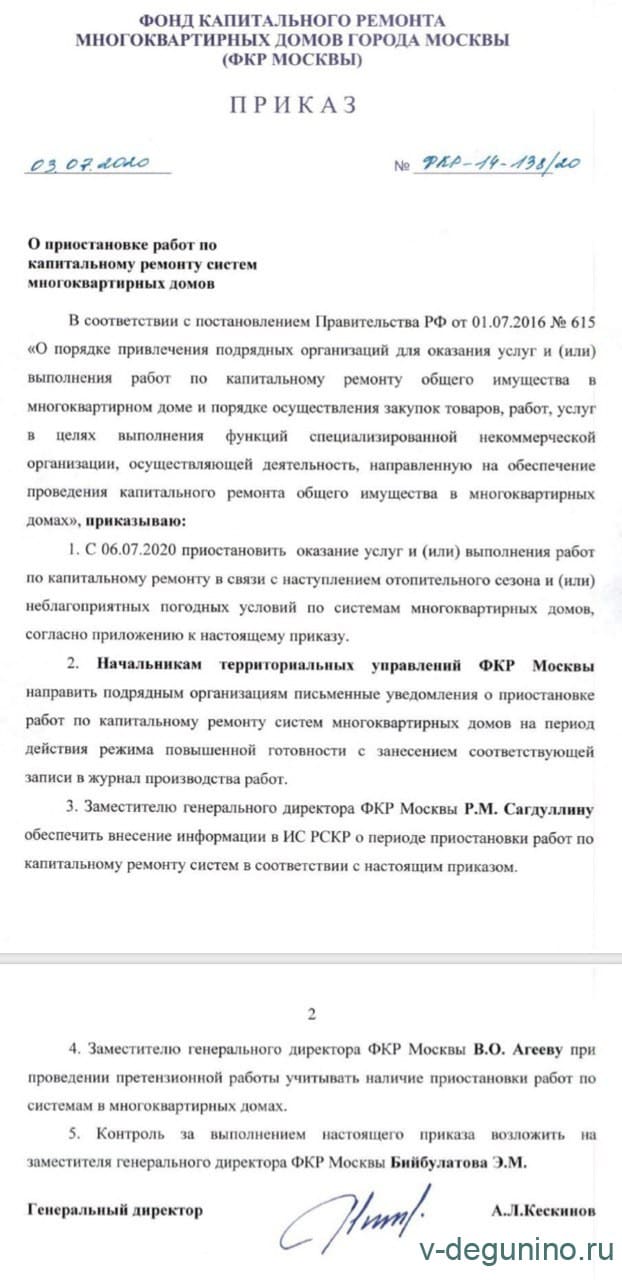 Фонд Капитального Ремонта Москвы приостановил проведение работ по капитальному ремонту с 06.07.2020 г.