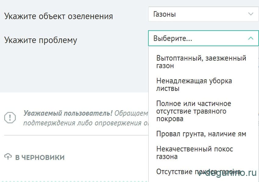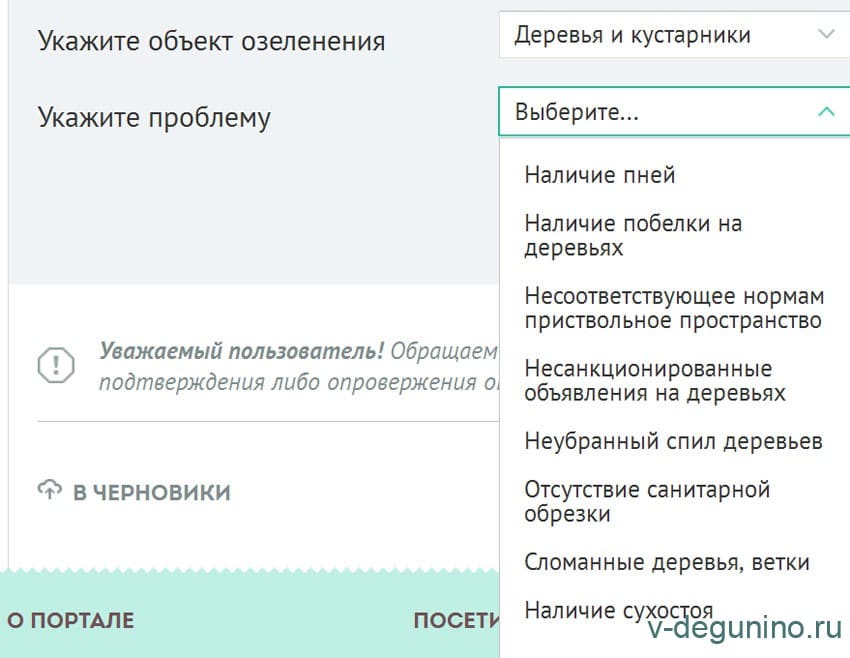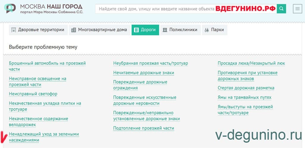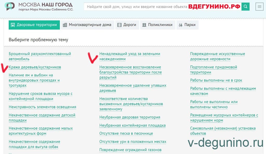 А также подпроблемы по темам “Ненадлежащий уход за зелеными насаждениями” во дворе, в парке, на дороге и на территории государственного учреждения: