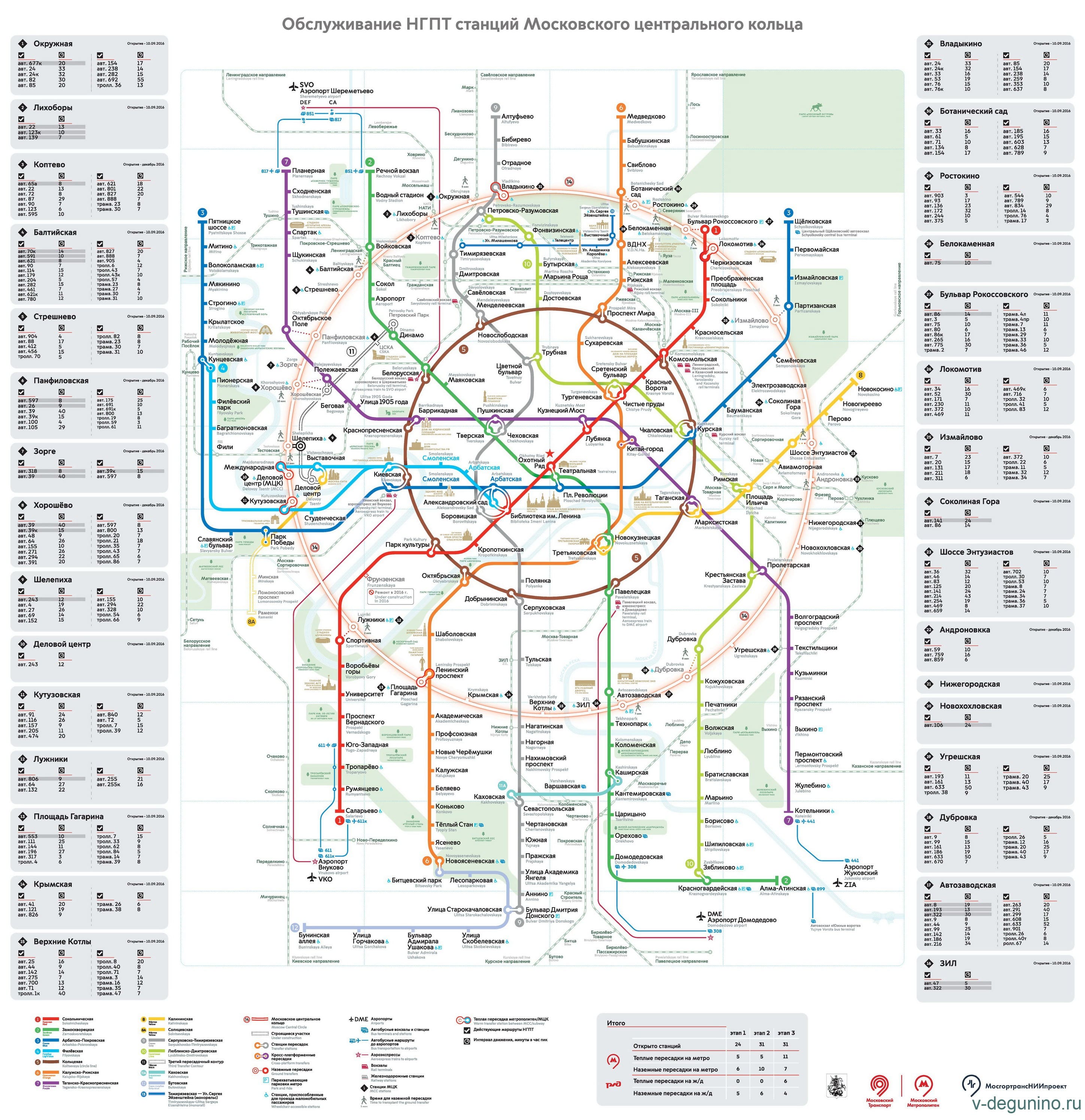 Ниже приведены схемы МЦК, на которых отображены пересадки со станций Московского кольца на наземный и пригородный транспорт, а также этапы введения в эксплуатацию пассажирской инфраструктуры.