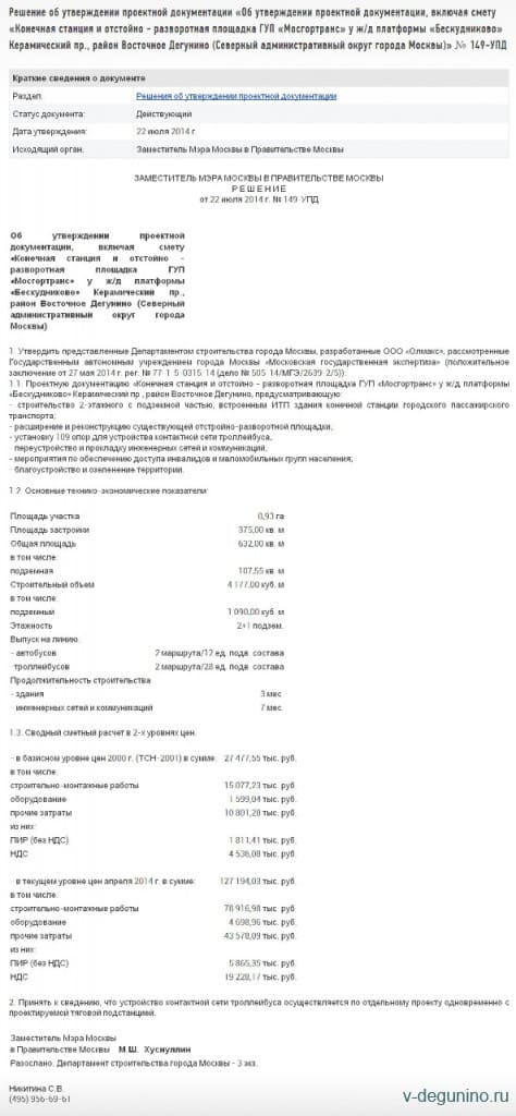 Решение об утверждении проектной документации «Об утверждении проектной документации, включая смету «Конечная станция и отстойно - разворотная площадка ГУП «Мосгортранс» у ж/д платформы «Бескудниково» Керамический пр., район Восточное Дегунино (Северный административный округ города Москвы)» № 149-УПД от 22 июля 2014 г.