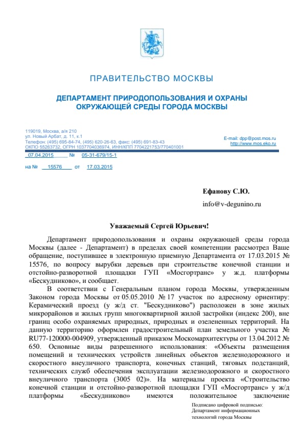 Пришёл обнадёживающий ответ из Департамента природопользования и охраны окружающей среды города Москвы (ДПиООС) по "Разворотный круг Мосгортранс у платформы Бескудниково".