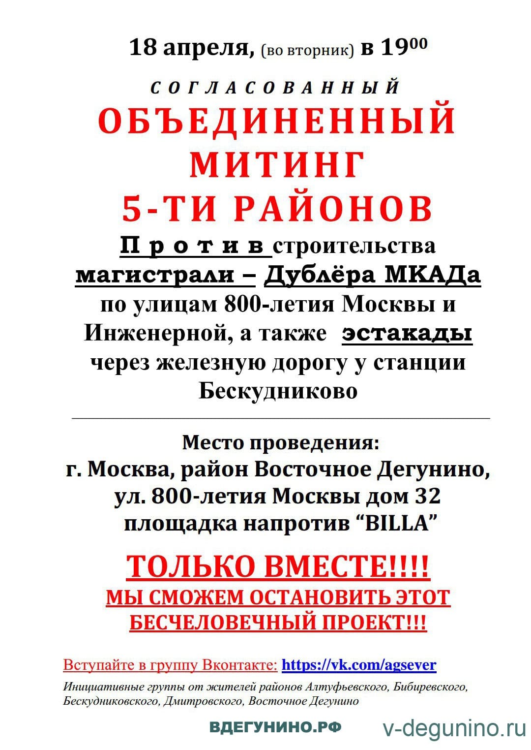 18 апреля (во вторник) 2017 года состоится Согласованный объединенный митинг жителей 5-ти районов САО и СВАО